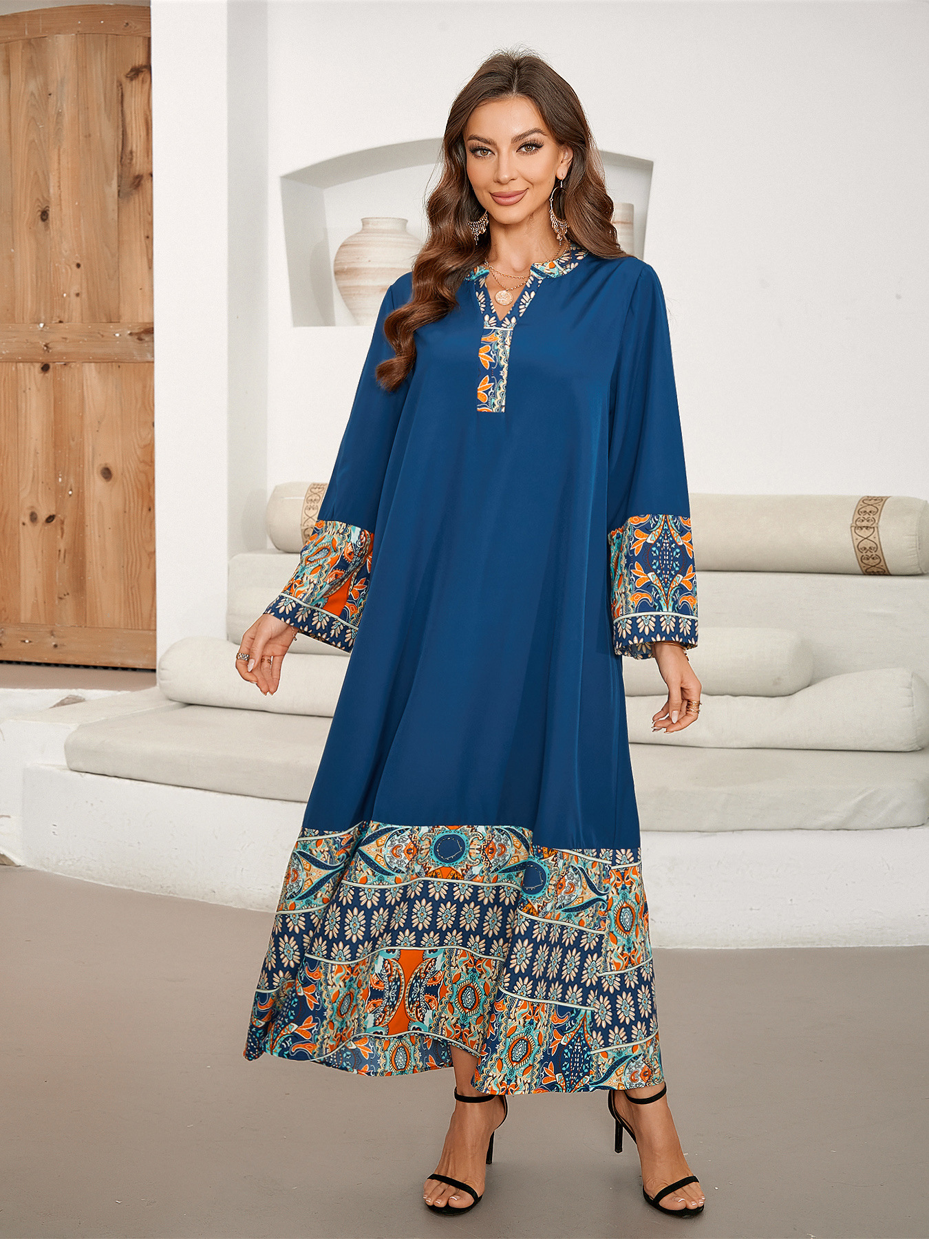 Cross-border Model Real Shot Hot Sale Printed Stitching Long V-Neck Elegant Mid-Long Sleeve Dress Middle East Blouse